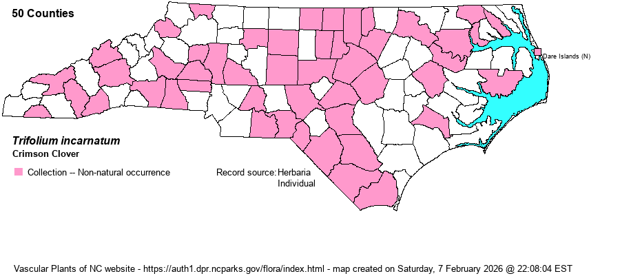 | Taxonomic Comments | Trifolium is a large genus of some 240-250 species globally, mostly north-temperate zone. Most are readily recognized as a clover by their 3 broad leaflets and globular to hemispherical head of densely-packed flowers. Flowers vary from white to pink, and red; the hop clovers have tiny yellow flowers. Some species were introduced for their forage value for livestock, others hitched a ride with hay, packing material, etc. Our two native species -- T. carolinianum and T. reflexum -- have suffered great loss of habitat and are now rare. | |