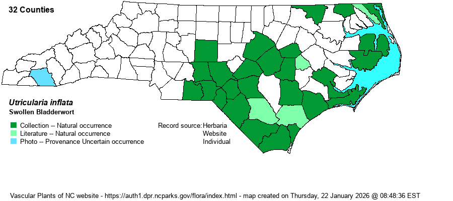 | Identification | This species and the very similar U. radiata, which have been included as one species in the past, are quite different from the rest of the bladderworts in the state. Each of these has expanded "floats" from the long flowering stalk, and these extend outward like spokes on a wheel along the top of the water surface. This species has the floats gradually tapering to the stem (from the middle of the expanded portion), whereas U. radiata has the floats nearly parallel-sided from the widest part of the float to the stem. Also, this species has more (bright yellow) flowers in the inflorescence, typically 9-14, as opposed to an average of 3-4 flowers in U. radiata. In general, this is a more attractive plant when in bloom, not only for its more flowers, but the flowers average more golden or bright yellow than the lighter yellow flowers of U. radiata; and also U. inflata has flowers about 2/3-inch across as opposed to about 1/2-inch across in U. radiata. Lastly, the flowering scape of U. inflata is taller, being about 9-10 inches tall, as opposed to the shorter stalk of U. radiata at roughly 5-6 inches tall. These two could grow together in the same pond or lake, but seldom does that seem to occur, as the ranges in the state are a bit different, though each is essentially a Coastal Plain species. | |