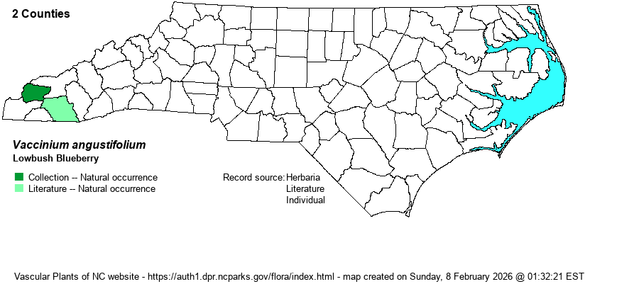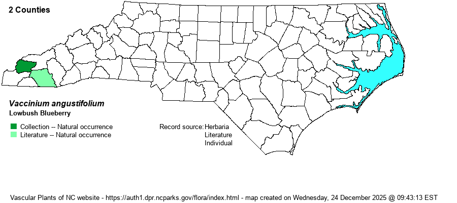 | Identification | This is our lowest-growing ericaceous, deciduous shrub of the exposed mountaintops, balds, and high openings, growing mainly only to 8 inches to 2 feet tall. It can be confused with several other blueberries, as the twigs are generally greenish like others, though they can be brown more toward the base. However, the leaves are narrowly elliptic to slightly lanceolate and more sharply pointed at both ends than similar species; they are essentially entire. So, identify the species primarily by its mainly very short stature (about 1-foot tall) and the slightly narrower and more “pointy-looking” leaves. Though this is a long-known and good species, as with V. altomontanum it is poorly known in the state and can be easily passed over as V. pallidum or another species around high elevation balds and outcrops unless you carefully study each blueberry you encounter! | |