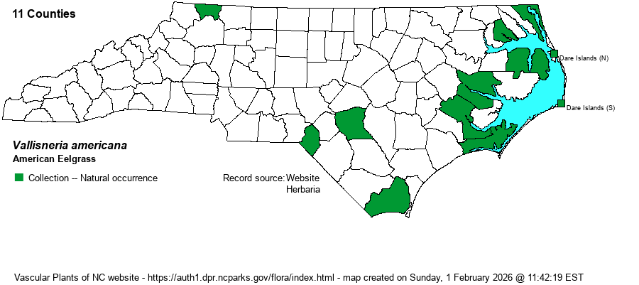 | Habitat | This species grows submerged in still or slow-moving waters of estuaries, rivers, ponds, and lakes. It often can be found in brackish and oligohaline waters of Tidewater Sounds. | |