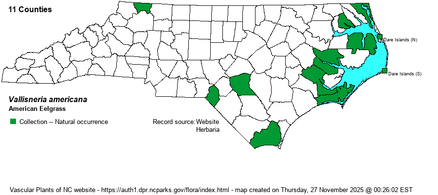 | Habitat | This species grows submerged in still or slow-moving waters of estuaries, rivers, ponds, and lakes. It often can be found in brackish and oligohaline waters of Tidewater Sounds. | |