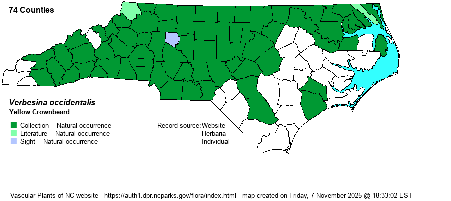 | Identification | Yellow Crownbeard is easily identified by its tall stems 3-8 feet tall. Leaves are numerous, opposite, lance-shape or elliptic, sharply toothed, and strongly narrowed to a stalk (from a somewhat truncate base). The leafstalks are somewhat decurrent onto the stem as wings. Heads are numerous in an open array, and large -- ray florets are 1-3 cm long and bright yellow. The disks are prominent, dome-shape, and yellow. The rays are often twisted and thus the flowers look "unkempt". Wingstem (V. alternifolia) is very similar but always has alternate leaves. Both species seem to be increasing, at least spreading in wetland clearings such as sewerline margins. In fact, both can be somewhat weedy, as each can quickly invade man-made clearings in wetlands. | |