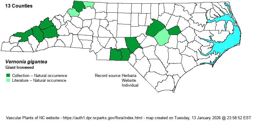 | Identification | Giant Ironweed is indeed tall -- up to 7 or more feet. Leaves are numerous and shaped like those of New York Ironweed (V. noveboracensis), which is far more commonly encountered in NC. It is best told from the latter by fewer-flowered heads (9-30 vs. 30-50) and acute to blunt tips of involucral bracts (vs. acuminate). This species also is downy on the underside of the leaves, whereas New York Ironweed is smooth. Also, the involucre is shorter (less than 7 mm) and florets fewer (less than 30) than in New York Ironweed. This species is presumably overlooked in the mountains among the quite common New York Ironweed. Both species are quite majestic in bloom. | |