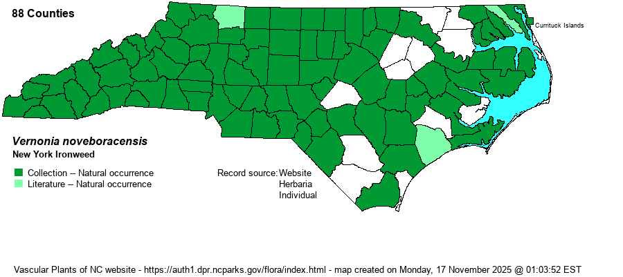 | Identification | New York Ironweed routinely reaches 6 feet tall, and may reach 8 feet. Leaves are numerous, narrowly elliptical, tapered to both ends, and the margins have small teeth. The open inflorescence supports a great number of pink to red-purple heads, though ray flowers are absent. It is best told from the rare Giant Ironweed (V. gigantea) -- essentially montane in NC -- by the latter having fewer-flowered heads (9-30 vs. 30-50) and acute to blunt tips of involucral bracts (vs. acuminate in New York Ironweed). As this species often grows in colonies or large stands, it is one of our most beautiful wildflowers. Stands of the plants in bloom are great attractants of butterflies, moths, and other insects for their nectar. | |