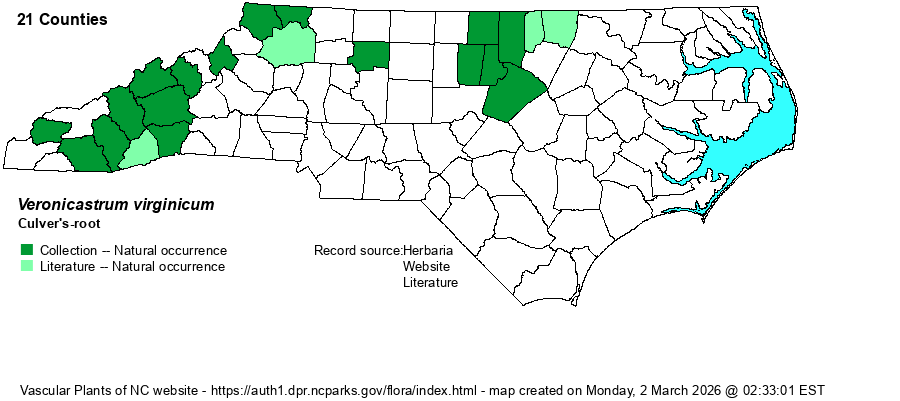 | Distribution | A split range in the state: found essentially over the Mountains, and also only in the northeastern Piedmont (south to Wake County). Only a single northern Piedmont record (Forsyth County) between these two areas.