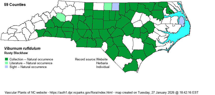 | Abundance | Fairly common in most of the Piedmont, but seldom really common. Infrequent to fairly common in the Coastal Plain, except rare in the far eastern counties. Very rare in the Mountains, at low elevations. Unlike some other Viburnum species such as V. rafinesqueanum and V. acerifolium, observers typically only see a few scattered individuals in a given forest stand, as opposed to sometimes hundreds of individuals. | |