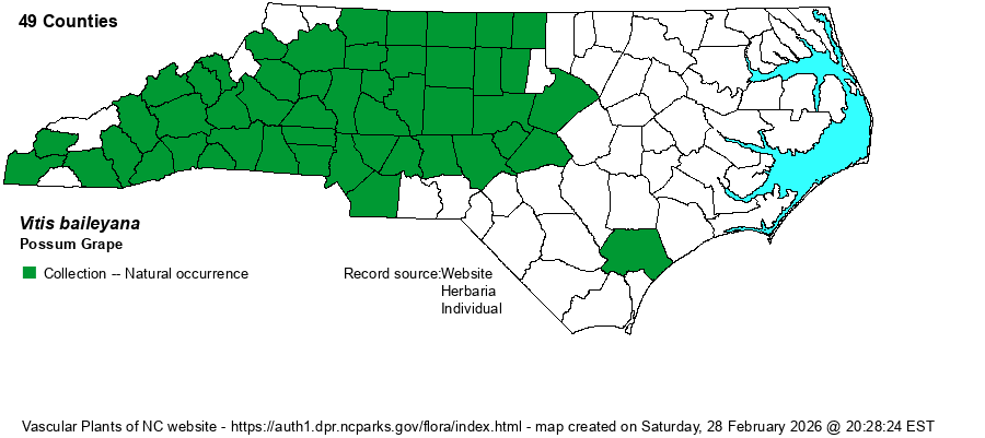 | Identification | This is a high-climbing, deciduous, woody vine, with large leaves to about 6 inches across. The leaves mostly have only small side lobes, with shallow sinuses; some are un-lobed. The leaves are often light green to pale green below but are not whitish/whitened. This species and the very similar V. simpsonii have angled “branchlets of the season” (as Weakley 2018 calls them), as opposed to rounded (terete) branchlets. Tendrils or inflorescences are not opposite each leaf, as they are in Vitis labrusca. This newly re-split species has smooth or nearly smooth branchlets and the nodes are usually banded with some red pigmentation; the similar V. simpsonii has more pubescent twigs and nodes usually have no red pigmentation. Check with more detailed keys, such as in Weakley (2018), to separate this species from others. | |