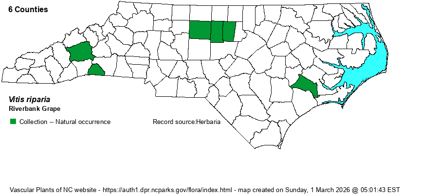 | Distribution | The most poorly known grape in the state, with records only for a few counties in the northeastern Piedmont, the southern Mountains, and one in the eastern Coastal Plain (Jones). As it occurs over much of VA and has been found in many border counties with NC, even in their Coastal Plain, perhaps the species is being overlooked, at least in the Coastal Plain.