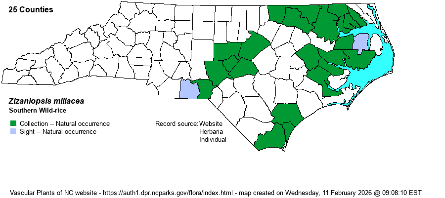 | Habitat | Shores, backwaters, and rocky riffles of brownwater rivers in the lower Piedmont, usually downstream from dams. On the Coastal Plain, fresh and fresh-tidal marshes of blackwater and brownwater rivers and streams. Now starting to appear along the margins of man-made ponds and impoundments. This species is so dominant on some islands in the Pee Dee River along the Anson/Richmond county line that the name of "Grassy Islands" refer to this grass. |