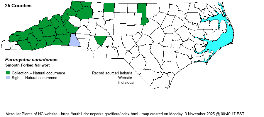 | Distribution | Throughout the Mountains; sparingly east into the western Piedmont, with disjunct records east to Person and Durham counties.