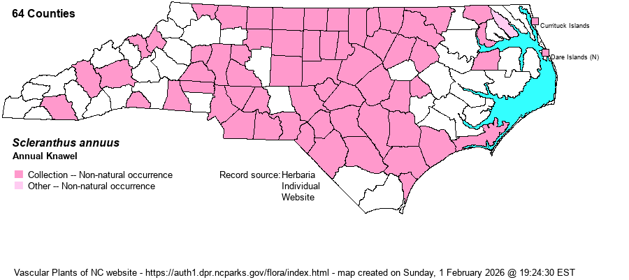 | Identification | Annual Knawel is a poster child for "weed." It looks like a weed, lives in poor soils, the flowers are tiny and lack petals, and nothing about it attracts interest. It is low-growing, much-branched, prostrate, and tends to form small patches that at most reach a foot across. The leaves are numerous and linear, sharp-tipped. The inflorescences are in axils and terminal, the green sepals usually surpassed by bracts. | |