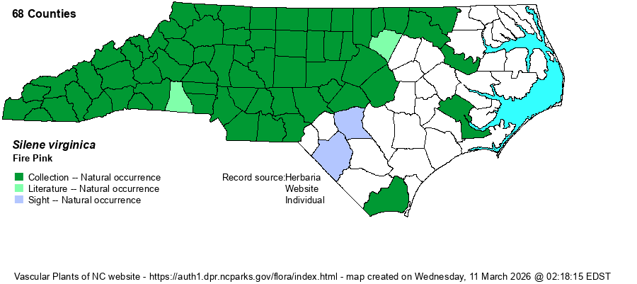 | Abundance | Common in the Mountains and western Piedmont; fairly common in most of the rest of the Piedmont. Rare to locally uncommon in the western parts of the Coastal Plain. This is the most numerous Silene in the Mountains and western Piedmont, though the overlooked S. antirrhina is probably more numerous in the rest of the state. | |