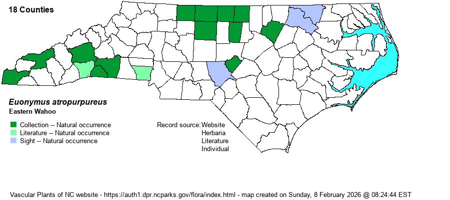 | Distribution | Scattered over the northern and far eastern parts of the Piedmont, and in the southern Mountains and adjacent foothills. Also occurs along the upper Roanoke River floodplain in Halifax and Northampton counties. Seemingly absent from most of the western and central parts of the Piedmont, for no obvious reason -- it is present at either edge (northeastern and southwestern). Clearly not present in nearly all of the Coastal Plain and likely also the northern Mountains. Strangely there is a lack of any photos on iNaturalist from wild plants in the state, though thankfully Will Cook has such photos from Caswell and Person counties on his Carolina Nature website.
