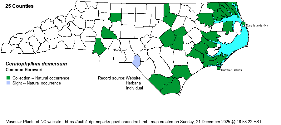 | Identification | Common Hornwort can best be told from our other two species by its leaves, which are only 1-2 times forked (vs. 3-4 times). Though hardly common, it is by far the most numerous of the 3 hornwort species in the state. | |