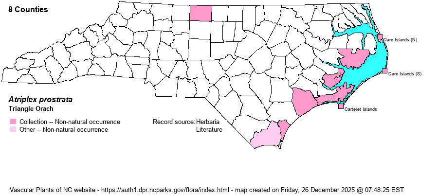 | Distribution | Coastal; believed to be not native in the eastern U.S., and possibly not even native at all in North America. Definitely Eurasian in native origin. The Rockingham County collection is from a railroad track in Reidsville. Weakley (2024) treats the species as non-native in the Southeastern states. Named as Atriplex patula in RAB (1968).