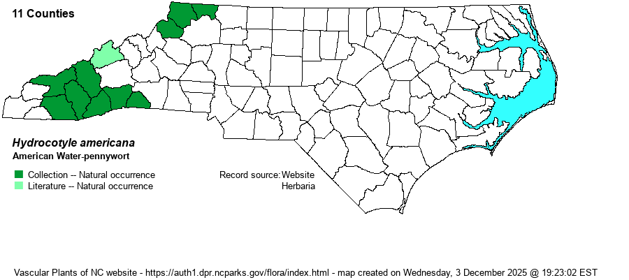 | Other Common Name(s) | American Marsh-pennywort. Most members of the genus are named as "xxxxx Marsh-Pennywort". These are nearly all Coastal Plain species, whereas most references name this Northern and montane species as Water-Pennywort more than Marsh-Pennywort. | |
