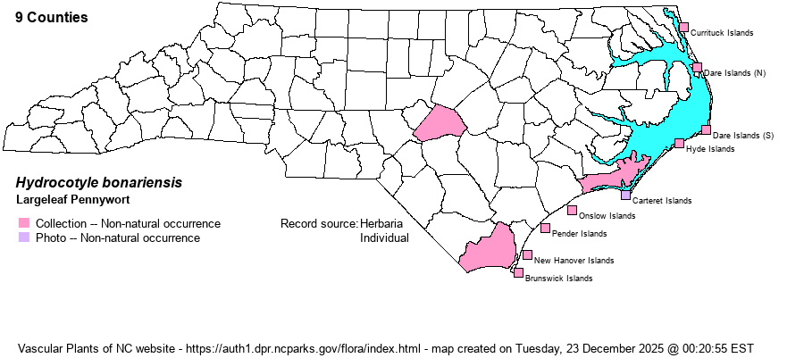 | Other Common Name(s) | Dune Pennywort, Seaside Pennywort, Giant Pennywort, Dollarweed. The common name of Largeleaf Marsh-pennywort is used on this website for the also non-native H. bowlesioides. | |