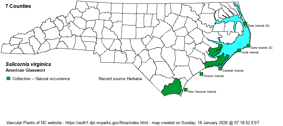 | Salicornia virginica | = | Salicornia depressa et | Flora of North America (1993b, 1997, 2000, 2002a, 2002b, 2003a, 2004b, 2005, 2006a, 2006b, 2006c, 2007a, 2009, 2010) | | | Salicornia virginica | < | Salicornia europaea | Gleason and Cronquist (1991) | , misapplied | | Salicornia virginica | < | Salicornia europaea | Gleason (1952) | , misapplied | | Salicornia virginica | < | Salicornia europaea | Godfrey and Wooten (1979, 1981) | , misapplied | | Salicornia virginica | < | Salicornia europaea | Radford, Ahles, and Bell (1968) | , misapplied | | Salicornia virginica | < | Salicornia europaea | Small (1933, 1938) | , misapplied | | Salicornia virginica | < | Salicornia europaea | Wofford (1989) | , misapplied | | Salicornia virginica | < | Salicornia europaea | Kühn in Kubitzki, Rohwer, & Bittrich (1993). [also see Sarcocornia] | , misapplied | | Salicornia virginica | >< | Salicornia europaea var. europaea | Fernald (1950) | | | Source: Weakley's Flora |