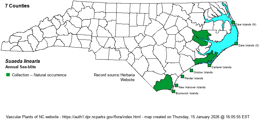 | Identification | Annual Sea-blite is a somewhat fleshy, branched plant typically 8 inches to 2 feet tall. Leaves are linear and pointy, 7-20 mm long and rather well-spaced on the branches, typically strongly ascending. Flowers occur singly in leaf axils; the fruits are lens-shaped and mostly covered by the 5 sepals. Not as fleshy as glassworts, sea-blites are typically taller plants that possess obvious leaves. A small stand of the plants can look like a seedling red cedar (Juniperus) at some distance. This is a familiar plant of our coastal marsh edges and salt flats, along with one or more species of glassworts (Salicornia). | |