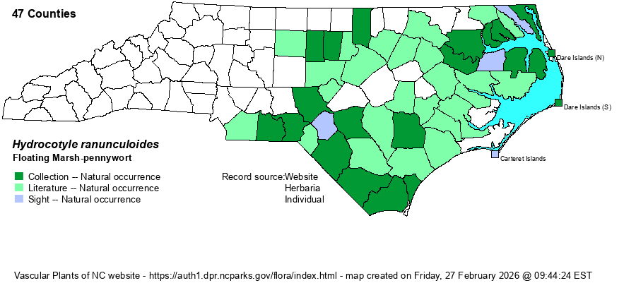 | Identification | This aquatic species, but rooted in the ground, has dark green, fleshy leaves (looking almost evergreen), on long stalks; the petiole joins the blade on the leaf underside, near an edge. The blades are usually held above water level, but can be floating. From above, the leaf has some moderate incisions (about halfway to the leaf middle), often cutting the blade into 3-5 lobes, and the margins are slightly scalloped. The flower cluster is a simple umbel, on a short stalk only half as long as a leaf petiole, and thus you likely will overlook the tiny white flowers on it. This species almost always grows in large patches, typically several square meters or more, and it is the primary Hydrocotyle found growing in stagnant water. The other species in the genus have leaf blades more orbicular and grow in mud or wetlands, but seldom in standing water. | |