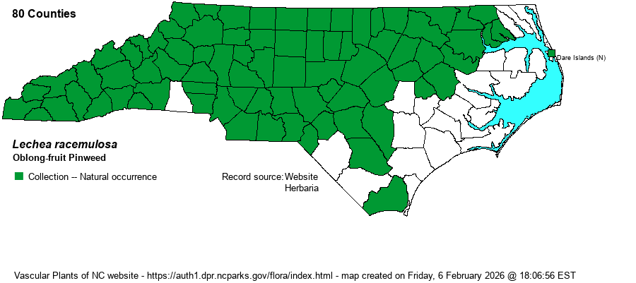 | Abundance | Common across the Mountains and Piedmont; fairly common to common in the western Coastal Plain, but very rare to absent in the eastern counties, though there are a few scattered records in this part of the state. This is essentially the only Lechea species in the Mountains and far western Piedmont, with a few others tending to be rare in these regions. | |