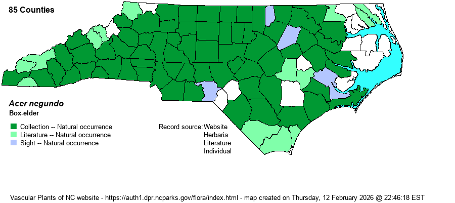 | Taxonomic Comments | Not surprisingly for such a broad-ranging species, a handful of varieties are named. The nominate variety – var. negundo – is the one that occurs nearly statewide and is confirmed for the state.