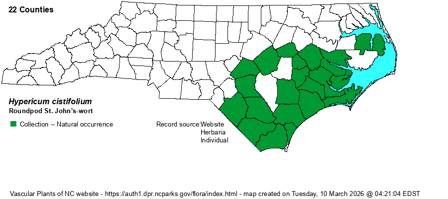 | Other Common Name(s) | Though “Roundpod” isn’t a helpful name for most biologists, as the pods are often not seen, this seems to be the only common name that has been used. Sometimes there are simply so many species in a genus that grow in similar places as others, such as Hypericum species in the Coastal Plain, that a unique or good common name has never “stuck”. | |