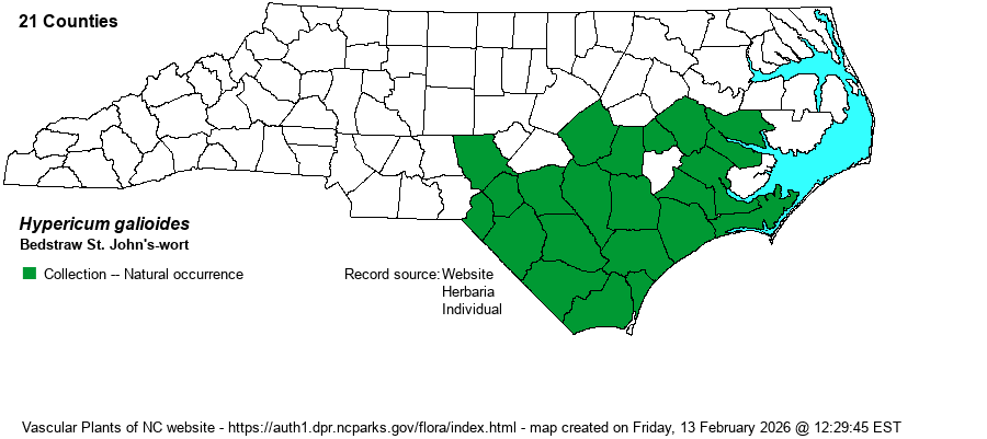 | Abundance | Generally common. This is the most numerous of the narrow/needle-leaved Hypericum species in the Coastal Plain. | |