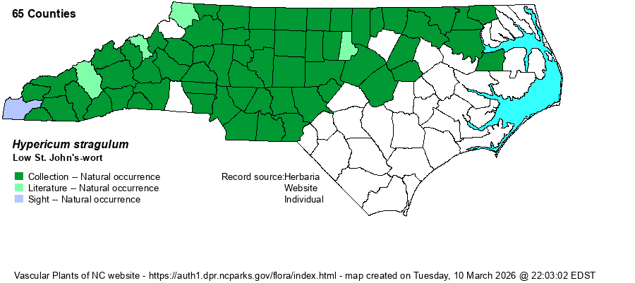 | Distribution | Found throughout the Piedmont, and over the southern and central Mountains. Also present in the northwestern Coastal Plain, south to Johnston and Washington counties. It appears to be absent in the northern Mountains and the southern two-thirds of the Coastal Plain. Occurrences in the Sandhills are misidentified, immature plants of H. hypericoides.