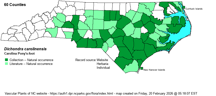 | Abundance | Often common to locally abundant in the southern part of the Coastal Plain; fairly common in much of the rest of the Coastal Plain, except rare to absent in the northwestern corner. Uncommon to locally common, and increasing, in the southern and eastern Piedmont. This is clearly an S5 species in NC, as it grows on roadsides and in lawns. | |