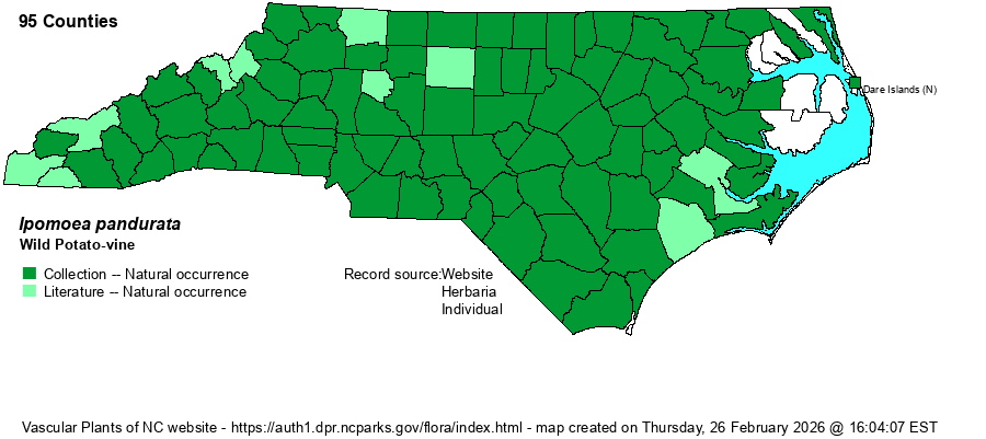 | Other Common Name(s) | Wild Sweet-potato, Manroot, Man-of-the-earth, Wild Sweet Potato-vine. For whatever reason, this native species has never had "morning-glory" as a part of any often used common name. | |