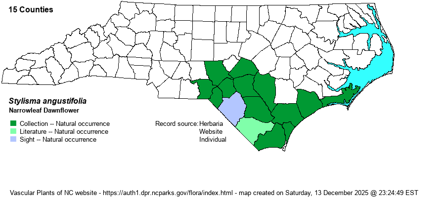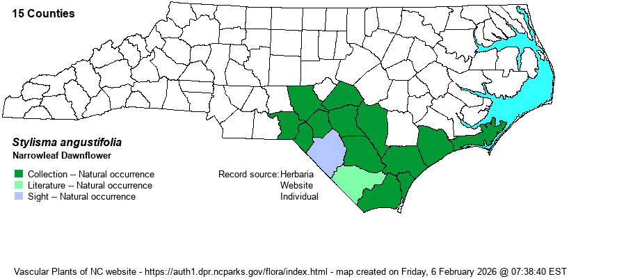 | Distribution | Limited to the southern Coastal Plain, mainly the Sandhills region and areas to the southeast. Ranges north to Carteret, Harnett, and Moore counties. The current name reflects an elevation to species status of the former Bonamia (= Stylisma) patens var. angustifolia (in RAB 1968).