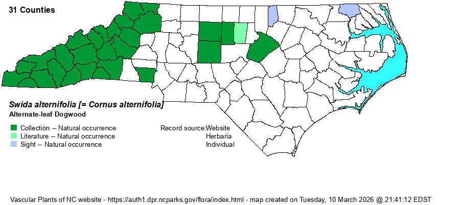 | Other Common Name(s) | Pagoda Dogwood. The species is frequently named as Alternate-leaved Dogwood. This website and many others try to avoid the “-ed” suffix in species names, as the “-ed” is added to a noun that is turned (sometimes awkwardly) into an adjective by adding the “-ed” ; i.e., the site prefers “Roughleaf Dogwood” (or “Rough-leaf Dogwood”) to “Rough-leaved Dogwood”. | |