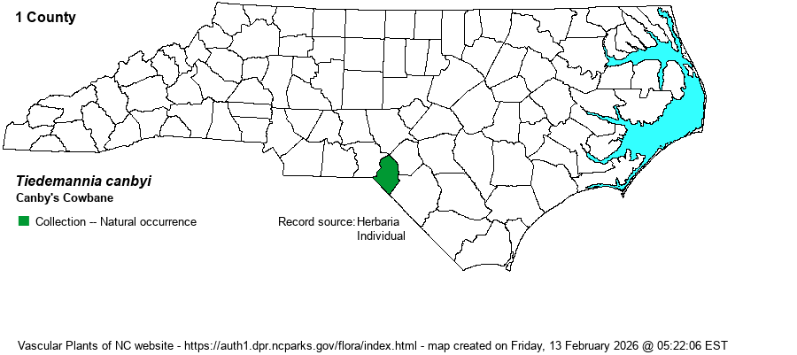 | Identification | This species is very similar to the much more numerous, though still scarce in NC, T. filiformis. Each is a tall herb growing to 3 feet tall or more, but with a slender stem. There are a few stem "leaves", each being "septate phyllodes" -- essentially just petioles, to about 6 inches long. The one to several umbels have very small white flowers. In this species, the lower "leaves" often drop by the time of flowering, whereas they are generally retained during flowering in T. filiformis. Also, this species has only 5-9 rays/umbellets per umbel, as opposed to a much more impressive 10-30 rays/umbellets per umbel in T. filiformis. There are also differences in the fruits of these two; see Weakley (2018) for details. T. filiformis is not yet known from the Carolina bay where T. canbyi grows, nor from Scotland County, nor apparently from Carolina bays. Even so, take care in identifying these two species. | |