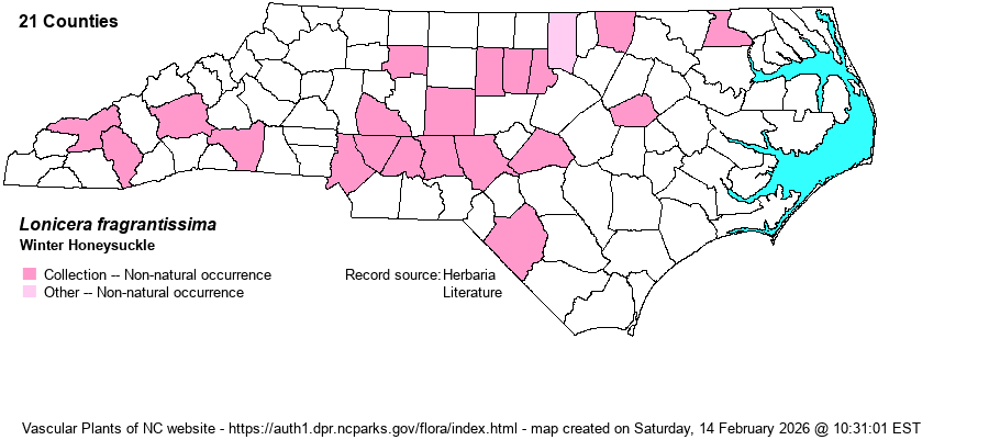 | Identification | Winter Honeysuckle is one of our first plants to bloom. It is a many-branched shrub to 7 feet tall, the leaves ovate to elliptical, short-stalked, and opposite. The flowers have short tubes and flaring lobes, white to yellowish or pinkish, reasonably fragrant. None of our other alien or native honeysuckles begin to bloom so early. | |