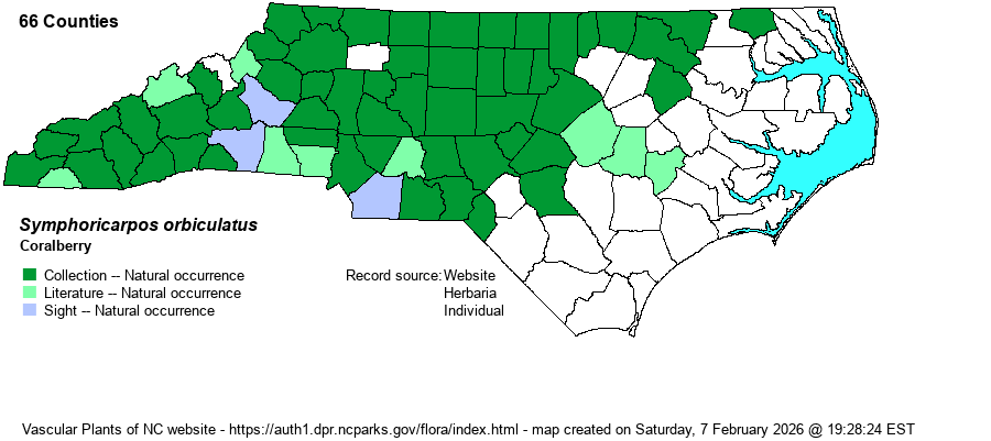 | Identification | This is a fairly low, colonial shrub with conspicuously slender branches/twigs, reaching about 3-4 feet tall. It has deciduous, opposite leaves that are quite small, being ovate to elliptic, entire, and averaging only about 1-inch long. It usually can be confused only with exotic species such as Chinese Privet (Ligustrum sinense), which has shinier green leaves (tending to remain on the plants through the winter) and is usually much taller. In flower or fruit, Coralberry cannot be confused, however. Though it has small and inconspicuous pale green flowers in the leaf axils, the fruits are strikingly magenta-colored; these purple berries remain in a tight cluster often well into winter on naked twigs, rendering this otherwise overlooked shrub quite attractive. | |