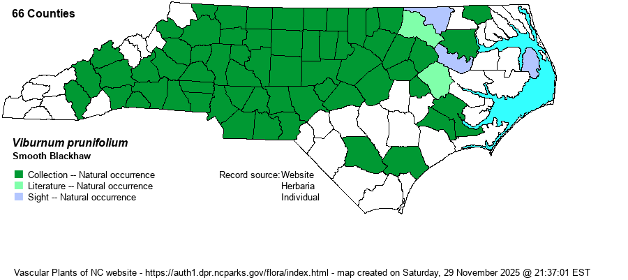 | Abundance | It is frequent to common in the Piedmont and is probably the most often encountered Viburnum species in the province. Fairly common to common at least locally in the northwestern Coastal Plain, but rare in the southeastern portions (except in rich soil areas). It can be fairly common in at least the central Mountain counties, but scarce in the north and in the southwestern corner. | |