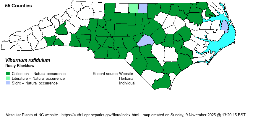 | Habitat | This Viburnum inhabits drier and poorer soil than most others, especially in the Piedmont and Coastal Plain. It favors dry oak-hickory forest, mixed pine-oak forests, hardpan forests (mafic soils), and various rocky forests. It favors circumneutral soils as opposed to strongly acidic sites, as does V. prunifolium. However, the latter species favors moist to rich soils as opposed to poorer soil for V. rufidulum; however, both species can be seen in the same woodland. |