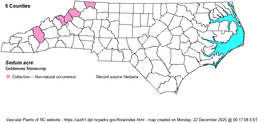 | Distribution | Mountains only. A specimen without county (at WCUH) is actually S. ternatum; a specimen from Granville County (at NCU) is S. sarmentosum.