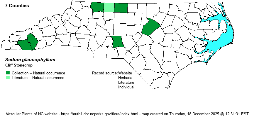 | Identification | This is a low-growing herb, typically branched at the base and decumbent or spreading, with glaucous (pale blue-green) foliage. The numerous, crowded, alternate leaves are narrowly oblong to spatulate, about 2/3-inch long but only 1/5-inch wide. At the ends of the branches are elongated flower clusters, in cymes. The 4 petals are white and narrow, with the spread flower about 1/3-inch across. S. ternatum is rather similar in growth form, but its leaves are primarily in whorls of 3-4 leaves. S. pusillum is an erect species of granitic flatrocks, with shorter and more elliptical leaves. When a group of S. glaucophyllum plants is seen on a rock face or outcrop, you should notice the horizontal/spreading look to the plants, which barely reach 3-4 inches tall but are much wider. | |