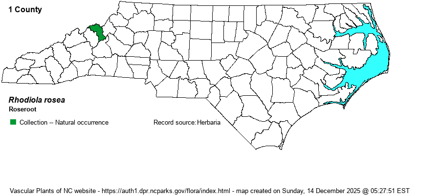 | Distribution | Known for certain (collections) only at the Roan High Bluff (also known historically as "Lyons Bluff") portion of Roan Mountain massif, in Mitchell County. Collections and reports elsewhere -- from Ashe County to Avery County -- almost certainly refer to Hylotelephium telephioides (a native species also or rocky places) or to some other member of Crassulaceae, perhaps even a non-native species.