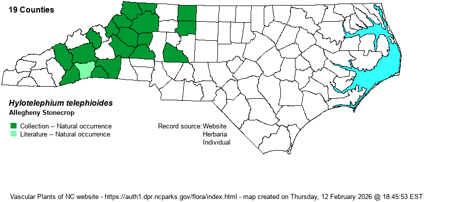 | Distribution | Present over most of the Mountains, but seemingly absent in the southwestern counties, with no records yet west of Haywood and Transylvania counties. Ranges into the western third of the Piedmont, mainly on monadnocks and outlier ranges. SERNEC specimens for Montgomery and Swain counties are not mapped, owing to a lack of access to view the specimen and lack or uncertainty of the habitat description.