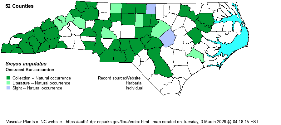 | Identification | This is a robust herbaceous vine, climbing to about 8-9 feet long. The leaves are alternate and somewhat large, having 3 principal triangular lobes, with small side lobes; the leaf base is broadly cordate. Each leaf, somewhat resembling those of many grape (Vitis) species, is about 5-6 inches wide and long. A long tendril and a tight cluster of male or female flowers, on a long stalk, are opposite each leaf. The male flowers and female flowers are somewhat similar, being white to cream, with 5 triangular lobes and a spread of about 2/3-inch -- quite star-shaped. The fruits are in tight clusters, each bur-like with spines and ovoid in shape, about 1/2-inch long. Note that the somewhat similar Echinocystis, of the New River floodplain in NC, has a single large bur, over 1-inch long, instead of a cluster of smaller burs; and that species has 6-parted flowers instead of 5 in Sicyos. | |