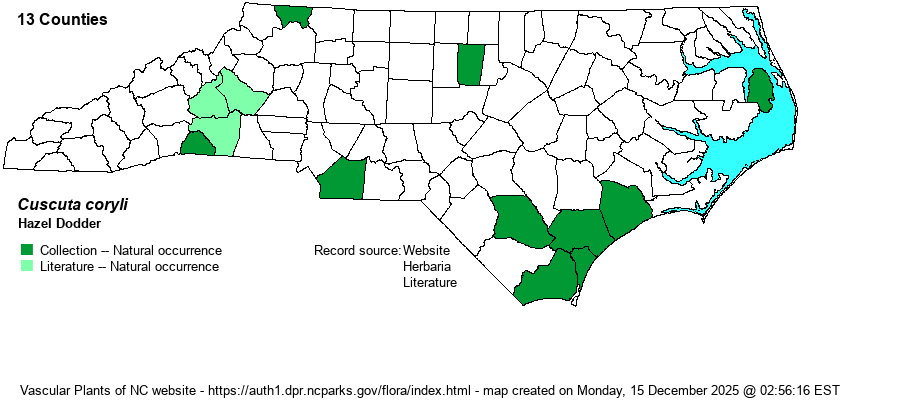 | Taxonomic Comments | The species of Cuscuta all share a few similar features, and they are difficult to separate except by mostly small characters, best seen with a hand lens or microscope. Each is a parasitic vine, lacking roots or true leaves, and nearly all are orange or yellow in color, twining up its host plant with the use of tiny aerial "roots". The small white flowers are in clusters along the stem. These plants should be quite familiar as a group, often presenting a tangled mass of orange vines growing over other plants. See Weakley (2018) or other references for keys to assist in identification. | |