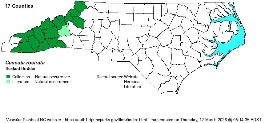 This is one of the few Eastern dodder species with a very small range -- being a Southern Appalachian endemic, ranging from WV and western VA south to extreme northeastern GA. | |