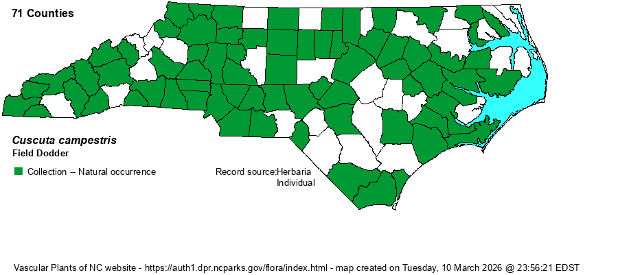 | Distribution | Statewide. Though there are collections for only around 70 counties, it seems likely that it occurs in all 100 counties. In general, iNaturalist photos are not used for populating the Cuscuta maps on the website owing to difficulty of identification from photos.