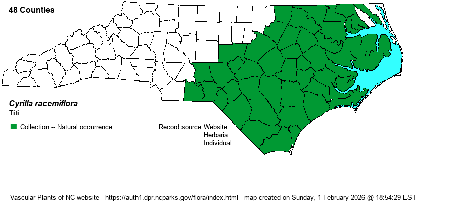 | Cyrilla racemiflora | < | Cyrilla racemiflora | Flora of North America (1993b, 1997, 2000, 2002a, 2002b, 2003a, 2004b, 2005, 2006a, 2006b, 2006c, 2007a, 2009, 2010) | | | Cyrilla racemiflora | < | Cyrilla racemiflora | Godfrey and Wooten (1979, 1981) | | | Cyrilla racemiflora | < | Cyrilla racemiflora | | | | Cyrilla racemiflora | < | Cyrilla racemiflora | Wunderlin & Hansen Flora of Florida (3) | | | Source: Weakley's Flora |