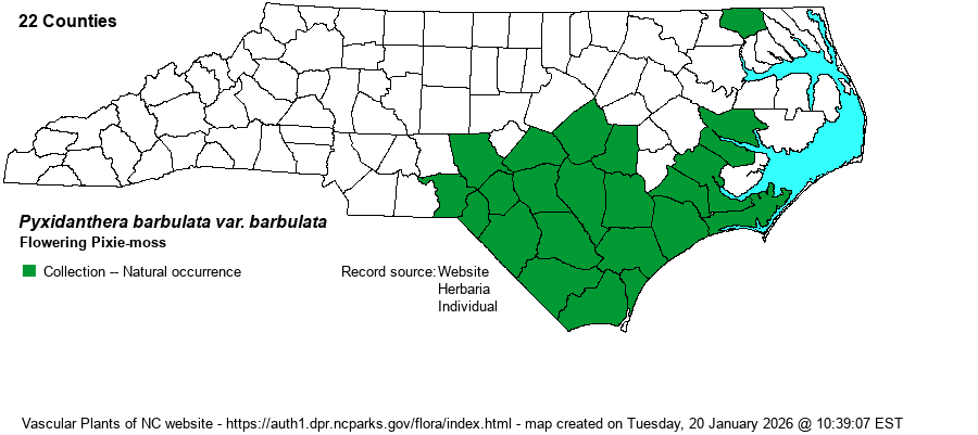 | Abundance | Uncommon to fairly common in the southern half of the Coastal Plain. In the Sandhills, both varieties occur but var. brevifolia is much more common. Occurs in dense “patches” and can be easily overlooked beneath leaves and taller vegetation. Though locally numerous on the Chowan Sand Banks in Gates County, it is extremely rare in the northern Coastal Plain. | |