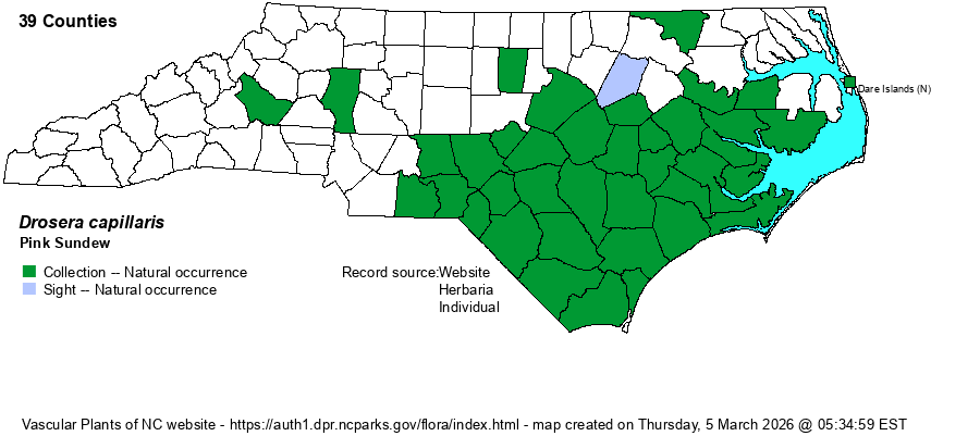 | Habitat | This is most widely occurring carnivorous species in terms of requiring only a tiny amount of habitat. Though it is primarily a pine savanna species, being as small as it and Drosera brevifolia are, D. capillaris is more readily found in scrapes, ditches, other muddy places, seeps, and powerline clearings that mimic a savanna than in the middle of a savanna (where it can easily be smothered by taller vegetation). Schnell, in his Carnivorous Plants of the United States and Canada (1976), states "I always think of it as the minimal carnivorous plant, since if a likely location for carnivorous plants can support only one species it will probably be the hardy D. capillaris." | |