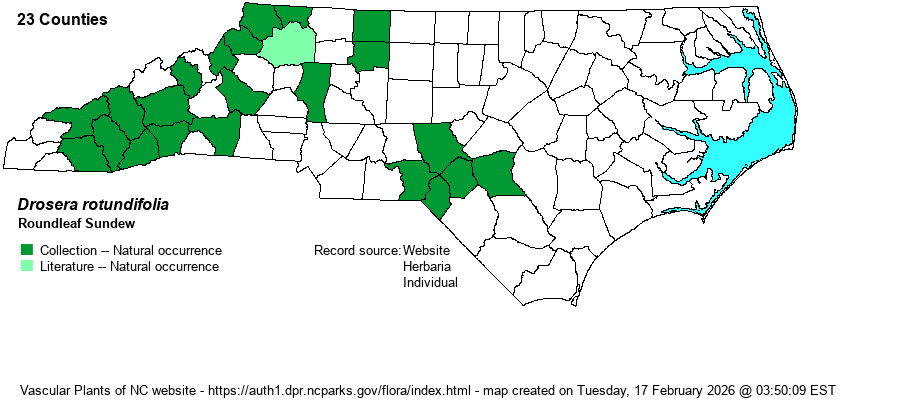 | Distribution | The only sundew that grows in the NC Mountains, it is found essentially throughout that province, and sparingly into the western Piedmont east to Stokes, Forsyth, and Iredell counties. It is disjunct eastward to the Sandhills region, where known from nearly all counties there but very sparse.